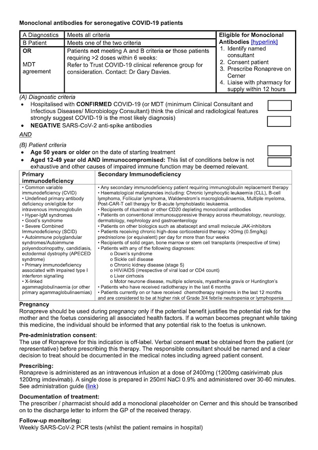 Casirivimab, Imdevimab and Sotrovimab are US FDA approved recombinant neutralizing human IgG1 monoclonal antibodies that target the receptor binding domain of the spike protein of SARS-CoV-2. Whilst not yet evaluated and NICE approved in UK, they may become available for use in the near future; updates to follow.