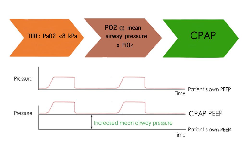 Imagining that the alveoli collapses with every breath out, then must re-expand on inspiration shows why energy expenditure is increased in COVD pneumonia. Pulmonary infiltrates disturb the respiratory mechanics of ventilation, pulmonary infiltrates cause collapse of normally open alveolar units.CPAP delivers a continuous pressure (greater than the patient’s own (intrinsic) airway pressure (PEEP)) that splint airway, improving recruitment and reduced work of breathing.Remembering that Arterial oxygenation (Pa02) is proportional to the Mean Airway Pressure (MAP) multiplied by Fraction of Inspired Oxygen (Fi02) will help understand why delivery of pressurised air/oxygen mix will vastly improve hypoxia.
