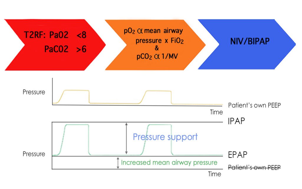 Recall now that Type 2 respiratory failure defined by hypoxia AND hypercapnoea is due to ventilatory failure, treat the oxygenation by providing increased MAP.In addition, treat hypercapnoea by increasing the minute ventilation (MV) by increasing the tidal volume. (MV = Respiratory rate multiplied by Tidal Volume).Tidal volume can be manipulated by providing a further increase of pressure at beginning of inspiration, this is called inspiratory positive airway pressure (IPAP). It lasts only during inspiration.At expiration, the airway pressure drops to an elevated (compared to patients intrinsic) PEEP called expiratory positive airway pressure (EPAP).